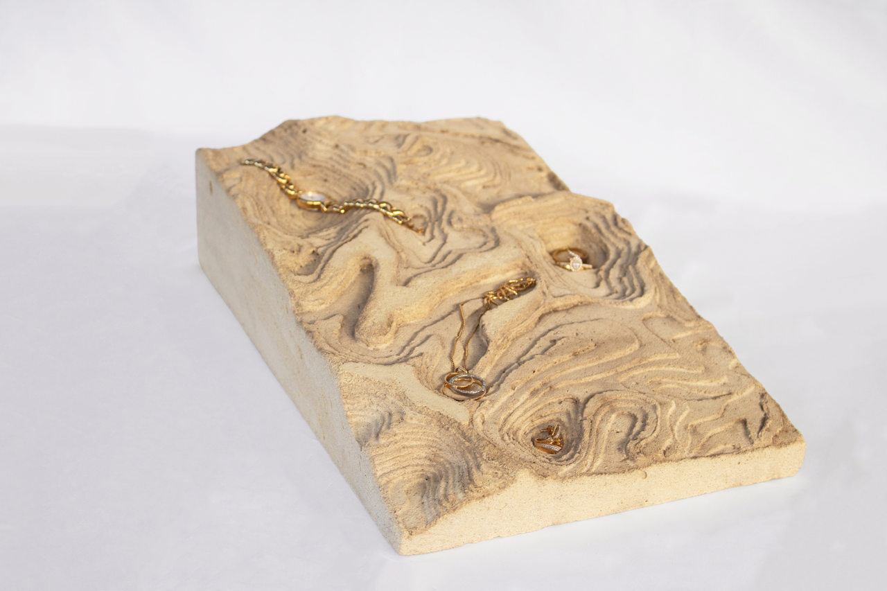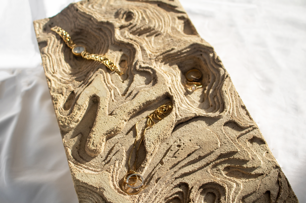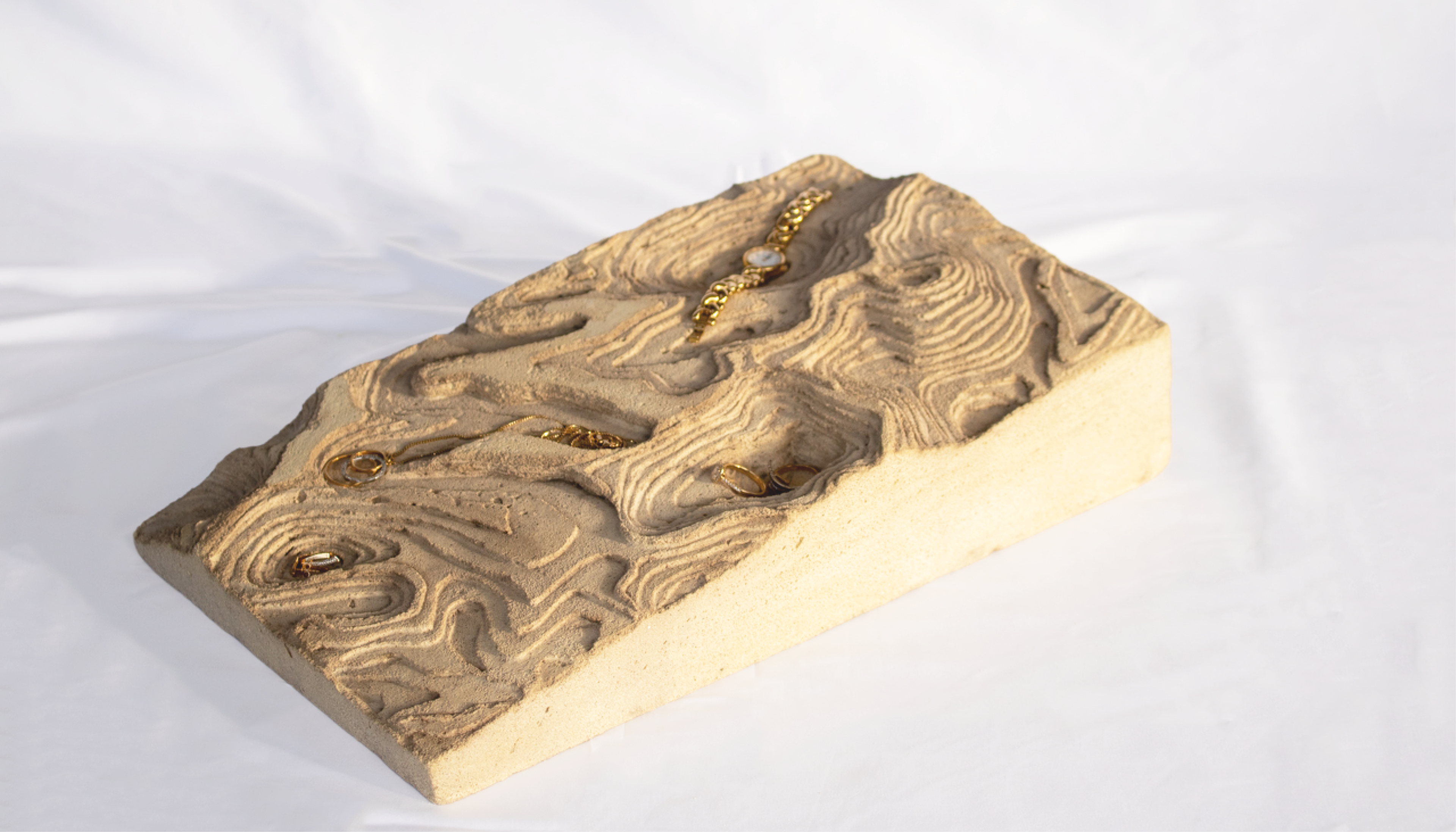 Wanneer een goudmijn volledig is uitgegraven, wordt ze als ‘uitgeput’ beschouwd. Dit idee van gelaagdheid en uitputting heb ik vertaald naar het ontwerp van de schaal. De vorm en textuur verwijzen naar de verschillende lagen van de aarde en roepen associaties op met tijd, leven en natuurlijke processen.Het resultaat is een juwelenschaal waarin het ruwe, industriële karakter van beton contrasteert met de verfijnde functie van het object. Zo ontstaat een spanningsveld tussen hardheid en kwetsbaarheid, natuur en gebruik.